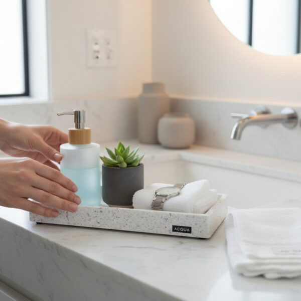 Perfeita para uso em lavabos, banheiros, quartos ou escritórios, a bandeja é ideal para acomodar sabonete líquido, difusor de aromas, perfumes ou objetos decorativos, mantendo o espaço organizado e harmonioso.