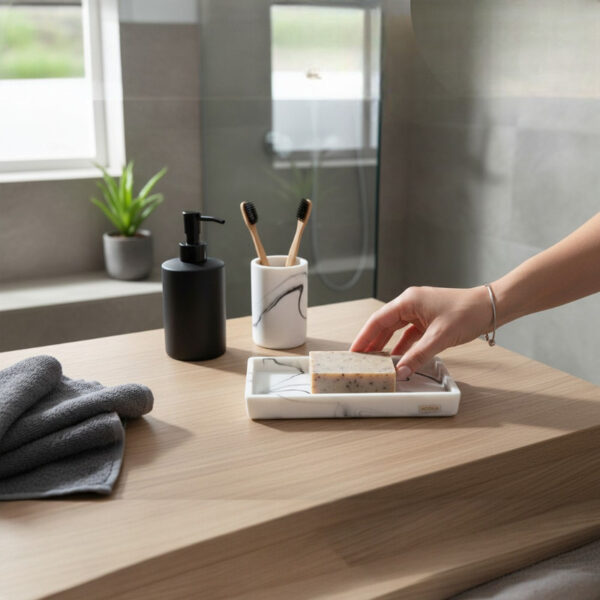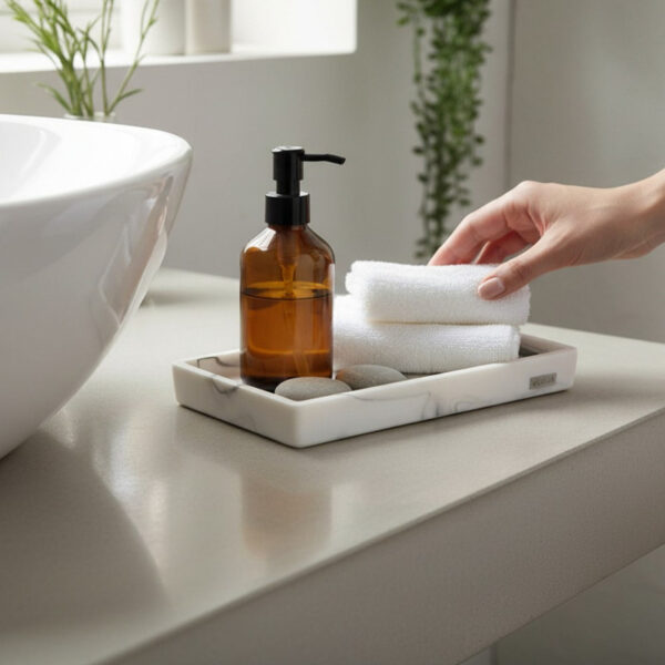 A bandeja de lavabo é a escolha ideal para adicionar um toque de elegância e sofisticação ao seu banheiro, harmonizando-se com diversos estilos de decoração.