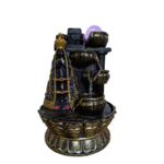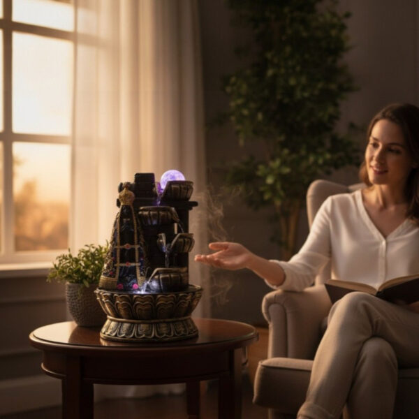 A água flui suavemente pelas tigelas, movendo a bola com o fluxo e criando um efeito relaxante tanto visual quanto sonoro. Ideal para ambientes internos como salas, escritórios, espaços de oração ou meditação.