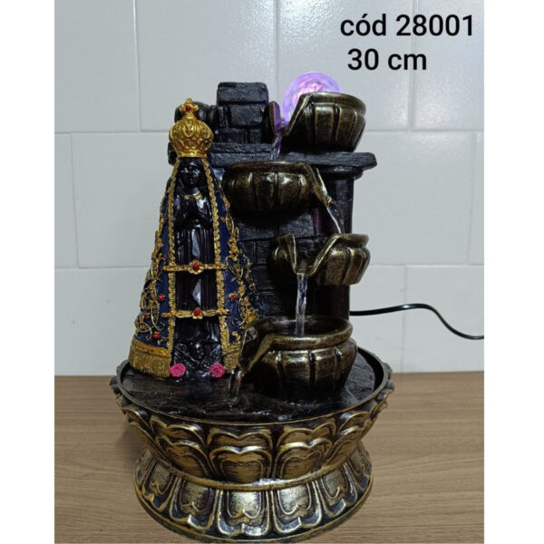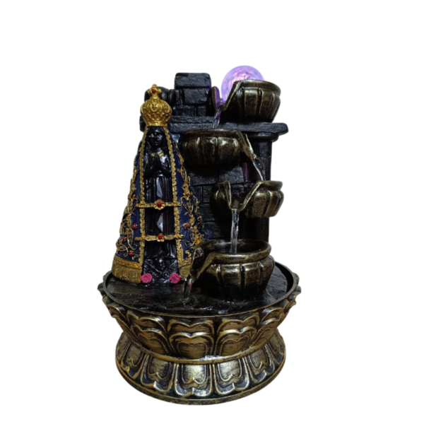 Renove a energia do seu espaço com esta fonte de água decorativa que une espiritualidade, beleza e tranquilidade. Com design sofisticado, a peça conta com cascatas em três níveis, uma bola giratória iluminada e a imagem detalhada de Nossa Senhora Aparecida, símbolo de fé e proteção.