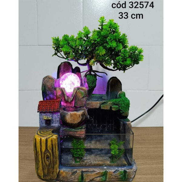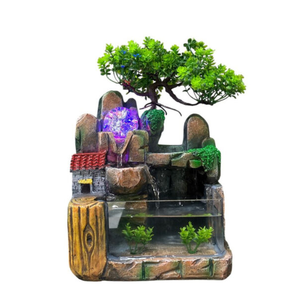 Elegante e cheia de detalhes, esta fonte decorativa combina o encanto rústico de uma pequena casa com telhado vermelho, pedras ornamentais e um aquário de vidro integrado à base. A água desliza suavemente entre as rochas, criando um efeito de cascata relaxante que transmite paz e harmonia ao ambiente.