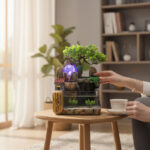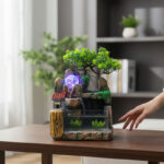 O aquário frontal de vidro permite visualizar a água e as plantas decorativas internas, tornando a peça ainda mais charmosa e dinâmica. Ideal para salas, escritórios, recepções ou espaços de meditação, esta fonte é perfeita para quem deseja unir decoração, iluminação e o som calmante da água em um único elemento decorativo.