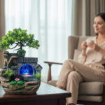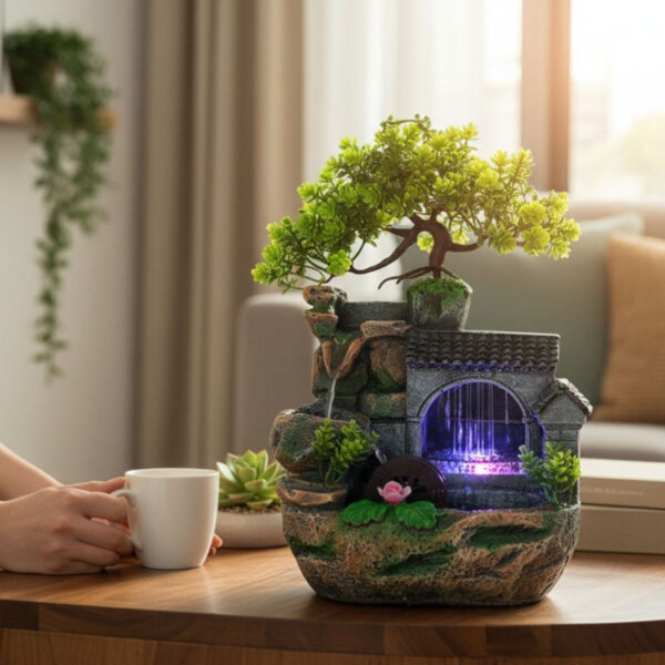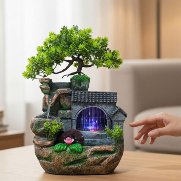 A água flui suavemente entre as rochas até alcançar a base, enquanto a iluminação interna em LED realça o efeito visual dentro do aquário de vidro, proporcionando um brilho colorido e sofisticado. O delicado bonsai artificial no topo acrescenta um toque de natureza e equilíbrio ao conjunto, tornando a peça ainda mais harmoniosa.