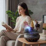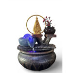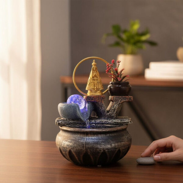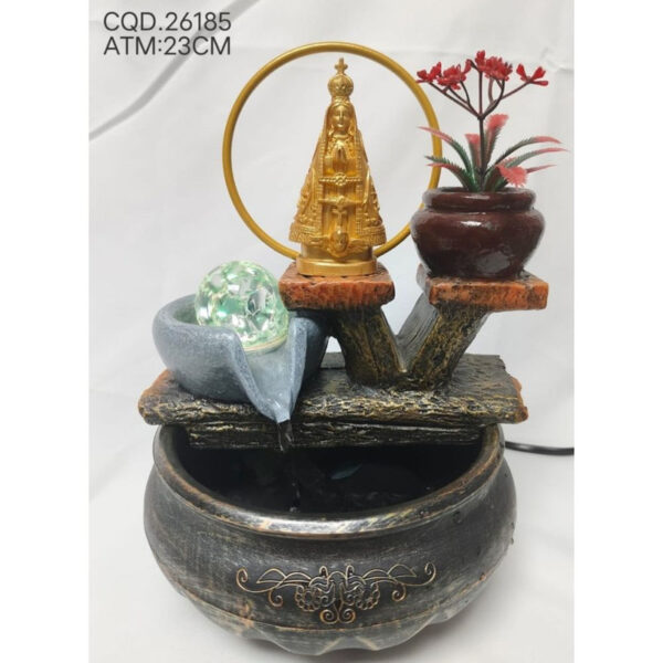 Fonte decorativa elegante e cheia de significado espiritual, com a imagem de Nossa Senhora Aparecida em destaque, envolta por um delicado arco dourado. A água escorre suavemente entre pedras ornamentais, iluminadas por LED azul, criando um efeito relaxante e acolhedor. Possui também um pequeno vaso decorativo com flores artificiais, que complementa o visual rústico e harmonioso da peça. Ideal para ambientes internos, espaços de oração, salas, escritórios ou como item decorativo que transmite paz, fé e tranquilidade.