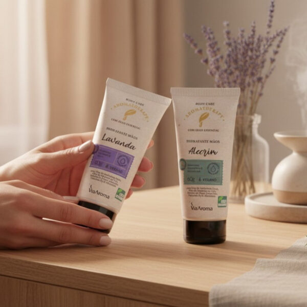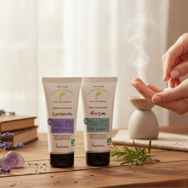 O Hidratante Mãos Alecrim+Lavanda da Via Aroma é um creme hidratante desodorante para mãos com fragrância aromática inspirada na aromaterapia. Ele combina óleos essenciais naturais para proporcionar hidratação, cuidado da pele e sensação sensorial agradável ao longo do dia.