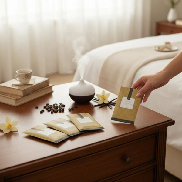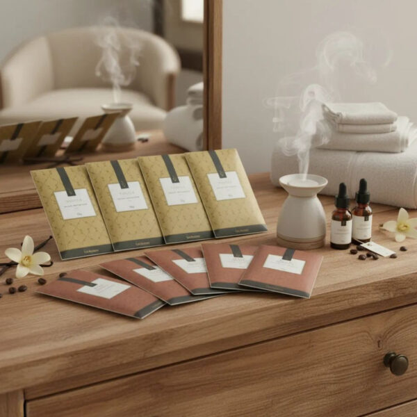 Os sachês perfumados são envelopes em que o aroma se desprende através dos poros do papel ocasionando a aromatização. Utilizados principalmente para aromatização de roupas, normalmente são colocados nas gavetas para que seu perfume se fixe nos tecidos. Use também em armários, closets, automóveis e bolsas. Duração aproximada de 45 dias.