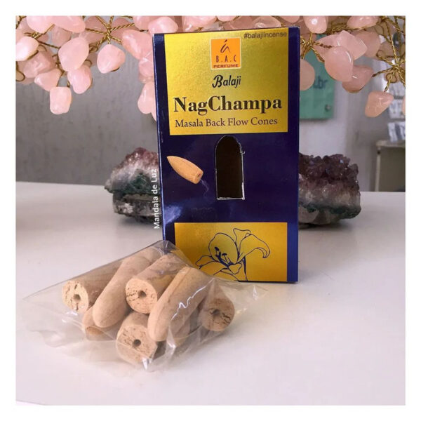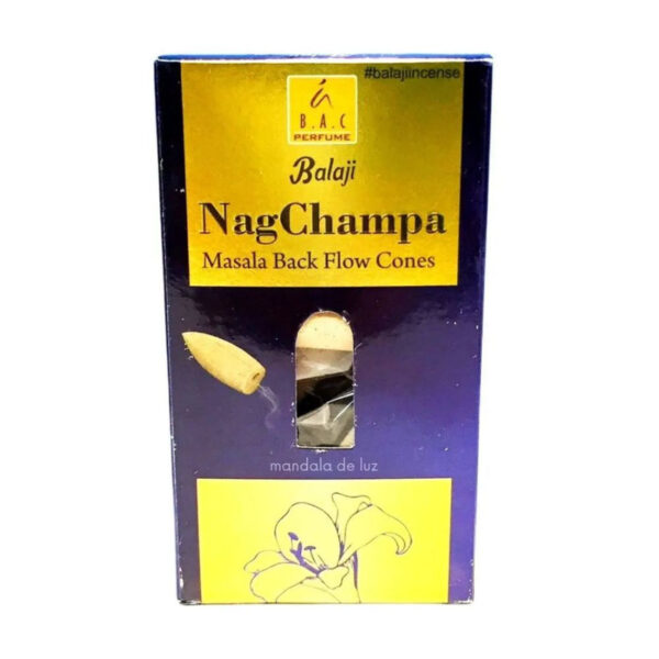 Incenso Cascata Backflow Massala Balaji Nag Champa com 10 cones é ideal para ser colocado no incensário de Cascata, ajudando a purificar e transmutar energias negativas. Criam um visual harmonioso com efeito cascata e emitem no ambiente um perfume delicado que energiza e traz boas energias para o lar.