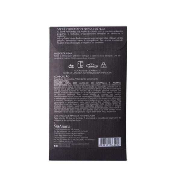 Notas amadeiradas e toques verdes gelados. Para a aromatização de armários e gavetas aposte no Sachê Perfumado Nossa Essência Via Aroma. É um produto para você colocar num cantinho e esquecer, permitindo que o delicioso aroma se espalhe. Perfeito para espaços fechados como gavetas, closets, armários e guarda-roupas, trazendo mais conforto para o seu dia a dia.