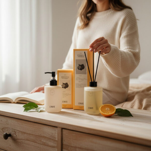 • Difusor de Perfume – 220 ml (Bergamota & Framboesa), com varetas que perfumam o ambiente de forma contínua e suave.