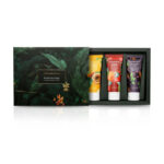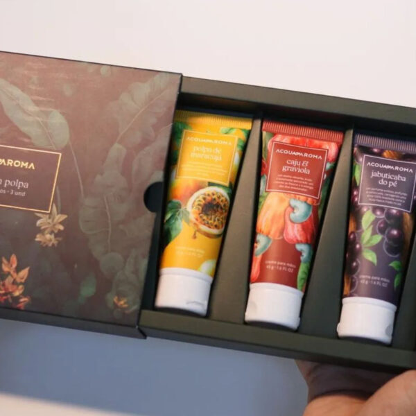 Cada fragrância representa a exuberância da natureza tropical: Polpa de Maracujá Caju & Graviola Jabuticaba do Pé Perfeito para manter na bolsa, no trabalho ou onde você estiver, o kit oferece um gesto de autocuidado a qualquer hora do dia.