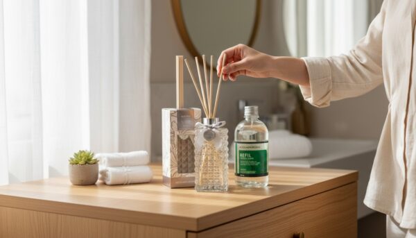 Retire a tampa, insira as varetas no frasco e aguarde alguns minutos para absorver a essência. Em seguida, vire as varetas para iniciar a difusão do aroma. Para manter a intensidade da fragrância, vire as varetas semanalmente.