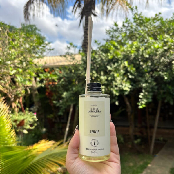 O Refil Difusor de Perfume Flor de Laranjeira 200ml, ideal para a reposição do líquido no frasco do difusor, sendo uma opção prática e sustentável.
