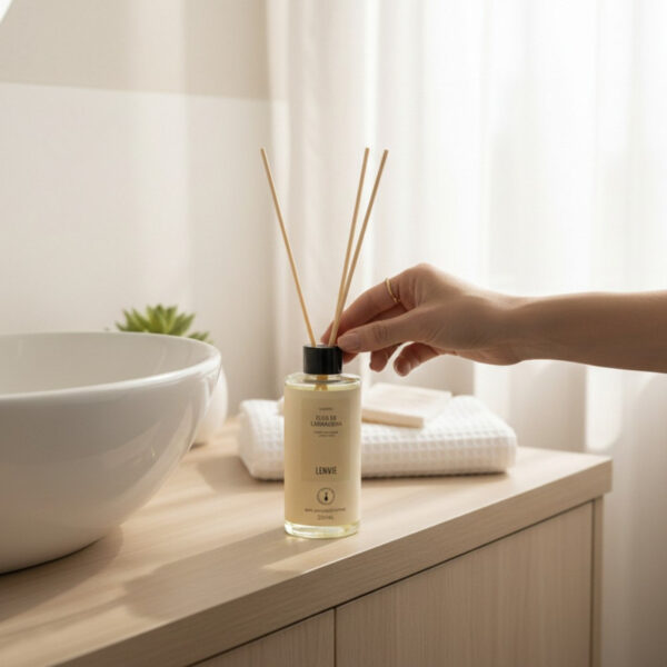 Retire a tampa e transfira o líquido para uma embalagem de vidro. Utilize preferencialmente no frasco do difusor original. Coloque a tampa de volta e insira as varetas. É importante que as varetas fiquem posicionadas com distância entre si e que tenham ao menos 10cm para a parte de fora do frasco. Para melhor difusão da fragrância, sempre que necessário vire as varetas.