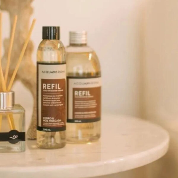 O refil para aromatizante de ar de 200ml com aroma de cedro e noz moscada promete transformar seu lar em um santuário de sofisticação.