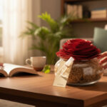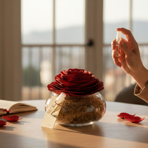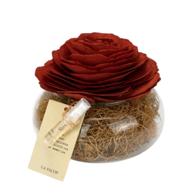 Uma linda rosa vermelha de madeira exala “Intensidade” com notas de chocolate, laranja, flores e baunilha. Pefumar e decora o ambiente.